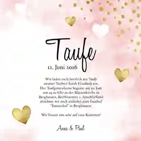 Menükarte zur Taufe in rosa mit goldenen Punkten und Herzen (kein Golddruck). Einfach zu gestalten!