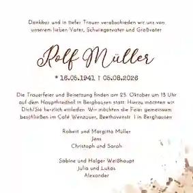 - Im Falle von Einladungen zur Trauerfeier: Ort, Datum und Uhrzeit der Feierlichkeiten ergänzen.