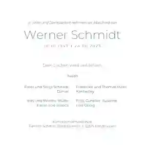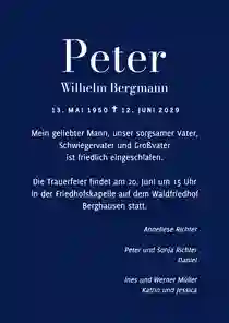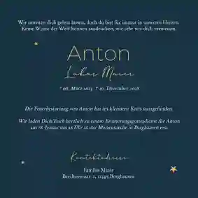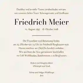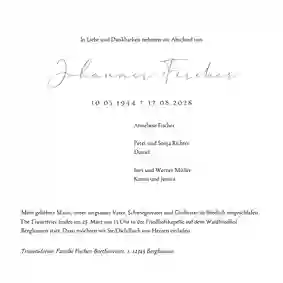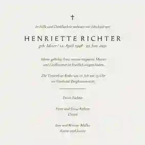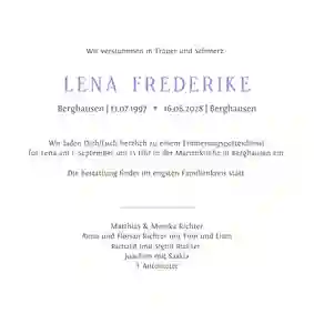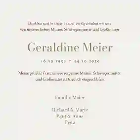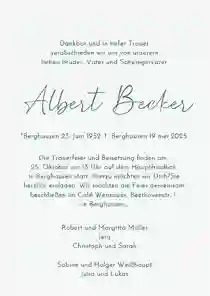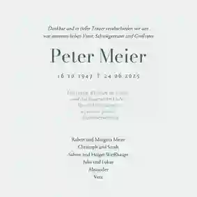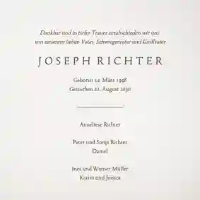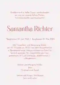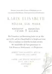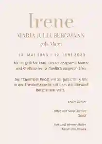 Es ist nie leicht, Worte zu finden, wenn ein geliebter Mensch gegangen ist. Wir helfen dir dabei, eine würdevolle Einladung zu gestalten, die deine Gefühle ausdrückt und alle wichtigen Informationen enthält. Mit unserem online Designtool kannst du in wenigen Minuten eine Trauerkarte erstellen, die genauso einzigartig ist wie die Erinnerung. Bei uns kannst du: