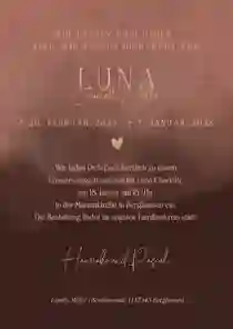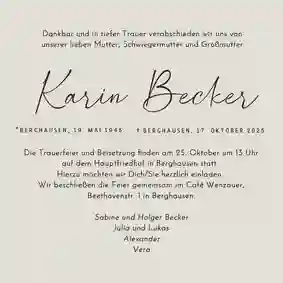 Mit wenigen Klicks kannst du eine Einladung zur Trauerfeier erstellen, die deine Worte und Gefühle auf würdevolle Weise trägt. Wähle aus stilvollen Designs, passe den Text nach deinen Wünschen an und bestelle schnell & unkompliziert – wir kümmern uns um den Rest, damit deine Einladungen rechtzeitig ankommen.