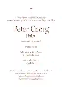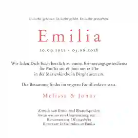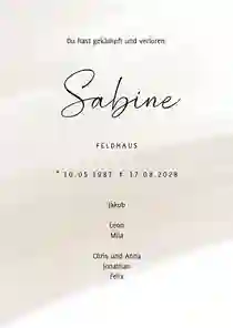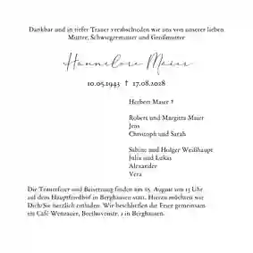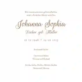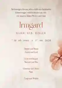 Es ist nie leicht, Worte zu finden, wenn ein geliebter Mensch gegangen ist. Wir helfen dir dabei, eine würdevolle Einladung zu gestalten, die deine Gefühle ausdrückt und alle wichtigen Informationen enthält. Mit unserem online Designtool kannst du in wenigen Minuten eine Trauerkarte erstellen, die genauso einzigartig ist wie die Erinnerung. Bei uns kannst du: