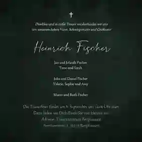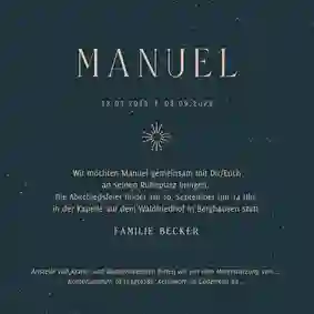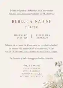 Mit wenigen Klicks kannst du eine Einladung zur Trauerfeier erstellen, die deine Worte und Gefühle auf würdevolle Weise trägt. Wähle aus stilvollen Designs, passe den Text nach deinen Wünschen an und bestelle schnell & unkompliziert – wir kümmern uns um den Rest, damit deine Einladungen rechtzeitig ankommen.