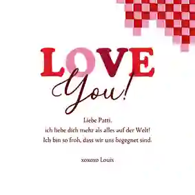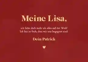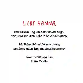 Alternativ kannst du ein kurzes Gedicht, einen romantischen Spruch oder ein liebevolles Zitat wählen. In unseren Kartenvorlagen findest du bereits Beispieltexte, die du übernehmen oder individuell anpassen kannst. Ideal, wenn dir die Worte fehlen.