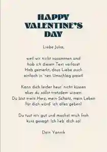 Alternativ kannst du ein kurzes Gedicht, einen romantischen Spruch oder ein liebevolles Zitat wählen. In unseren Kartenvorlagen findest du bereits Beispieltexte, die du übernehmen oder individuell anpassen kannst. Ideal, wenn dir die Worte fehlen.