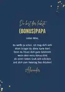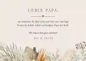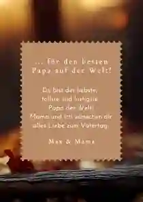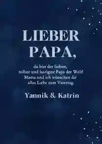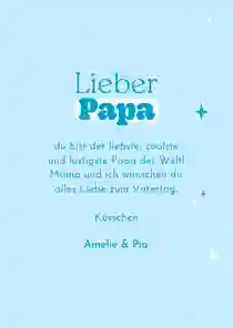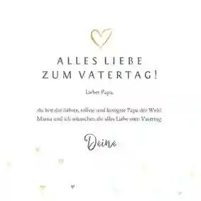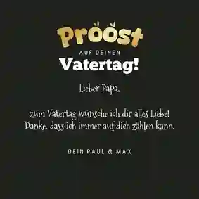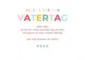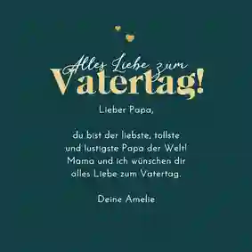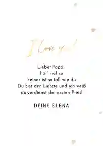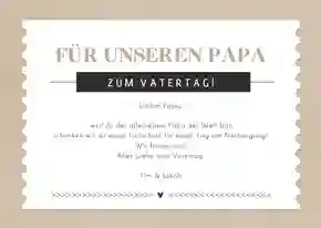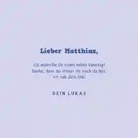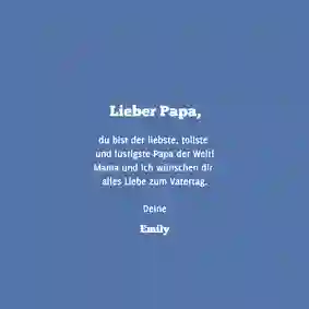 Alle Väter freuen sich über ganz persönliche Worte auf der Vatertag Karte. Persönliche Geschichten über Dinge, die du gemeinsam mit deinem Vater erlebt hast oder Erinnerungen an einen besonderen Moment. Fasse diese Gedanken in einem schönen Text zusammen. Schreib auch auf, was du an deinem Vater besonders magst, wofür du ihn bewunderst oder wofür du ihm danken möchtest.