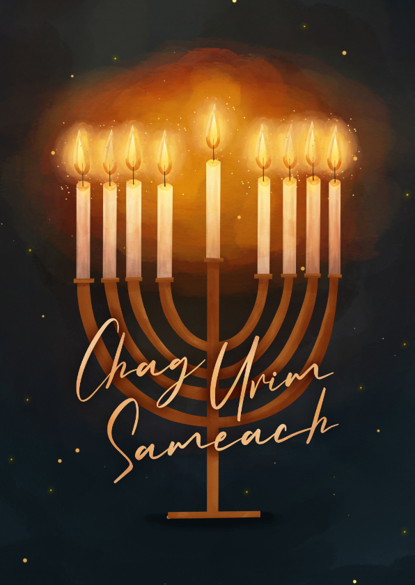 Stilvolle Chanukka-Karte mit 9-armiger Chanukkia und Schriftzug 'Chag Urim Sameach'. Einfach zu gestalten!