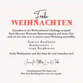 “All I want for christmas is beer” oder “Grüße an den liebsten Weihnachts(b)engel”? Lustige Weihnachtskarten Sprüche verleihen deiner Karte einen humorvollen Touch. Wähle entweder direkt eine Kartenvorlage mit Spruch auf der Vorderseite oder schreibe deine lustigen Weihnachtsgrüße selbst auf die Innenseite oder Rückseite deiner Karte. Wenn deine Familie und Freunde ein wenig Humor zur Weihnachtszeit verstehen, sollte ein witziger Spruch auf den Weihnachtskarten absolut nicht fehlen!