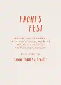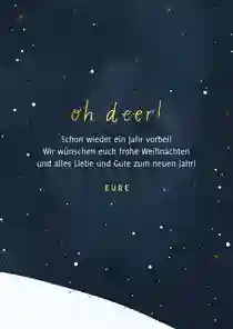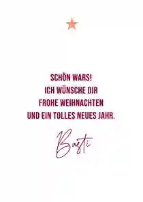 “All I want for christmas is beer” oder “Grüße an den liebsten Weihnachts(b)engel”? Lustige Weihnachtskarten Sprüche verleihen deiner Karte einen humorvollen Touch. Wähle entweder direkt eine Kartenvorlage mit Spruch auf der Vorderseite oder schreibe deine lustigen Weihnachtsgrüße selbst auf die Innenseite oder Rückseite deiner Karte. Wenn deine Familie und Freunde ein wenig Humor zur Weihnachtszeit verstehen, sollte ein witziger Spruch auf den Weihnachtskarten absolut nicht fehlen!
