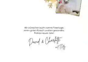 Hunde, Katzen und andere Vierbeiner gehören zur Familie! Und genau deshalb verdienen sie einen Ehrenplatz auf den Weihnachtskarten. Eine Weihnachtskarte mit Haustier-Foto sorgt für Schmunzeln beim Empfänger. Ob dein Hund mit Weihnachtsmütze oder deine Katze zwischen Geschenkpapier – tierische Motive kommen immer gut an.