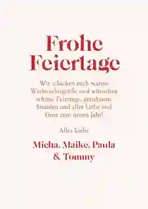 In unserem Kartendschungel warten schlichte Weihnachtskarten auf dich. Im Handumdrehen personalisierst du diese mit deinen Farben, Formen und Fotos. Du fügst deine Worte, Gedanken und Gefühle ein – je tiefer diese aus deinem Herzen kommen, desto eher treffen sie in das Herz deiner liebsten Menschen. Der Stil hat dabei nichts mit minimalistischen Weihnachtskarten zu tun – du findest moderne, lustige oder christliche Vorlagen.