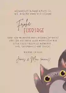 Kennst du jemanden, der Katzen über alles liebt? Oder bist du vielleicht selbst diese Person? Dann gestalte hier deine Weihnachtskarte mit Katze. Wähle Karten mit Fotos von flauschigen Kätzchen, nutze deine eigenen Katzen als Model, oder entscheide dich für lustige Illustrationen von Katzen, die mit Weihnachtsbaumkugeln oder einer Lichterkette spielen.