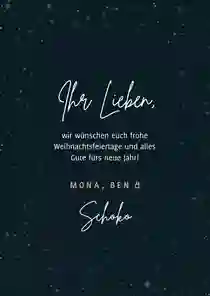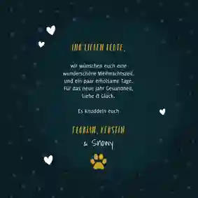Gemeinsame Spaziergänge, neue Orte erkunden und abends auf der Couch kuscheln: dein Hund ist dein bester Freund? Dann verdient dein flauschiger Vierbeiner natürlich auch einen Platz auf deiner Weihnachtskarte. Füge ganz einfach ein eigenes Foto deiner Fellnase hinzu und lass ihn von der Karte lächeln.