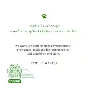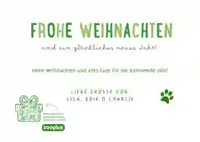 Verschicken Sie eine zooplus Weihnachtskarte mit Ihrem Lieblingsbild Ihres Haustiers? Wir verlosen unter allen verschickten Karten drei zooplus Gutscheine im Wert jeweils 100 Euro! Die Gewinner werden nach dem Zufallsprinzip unter allen eingelösten Aktionscodes ermittelt und bis spätestens 8. Januar per E-Mail benachrichtigt. Über die Ergebnisse kann keine Korrespondenz geführt werden.